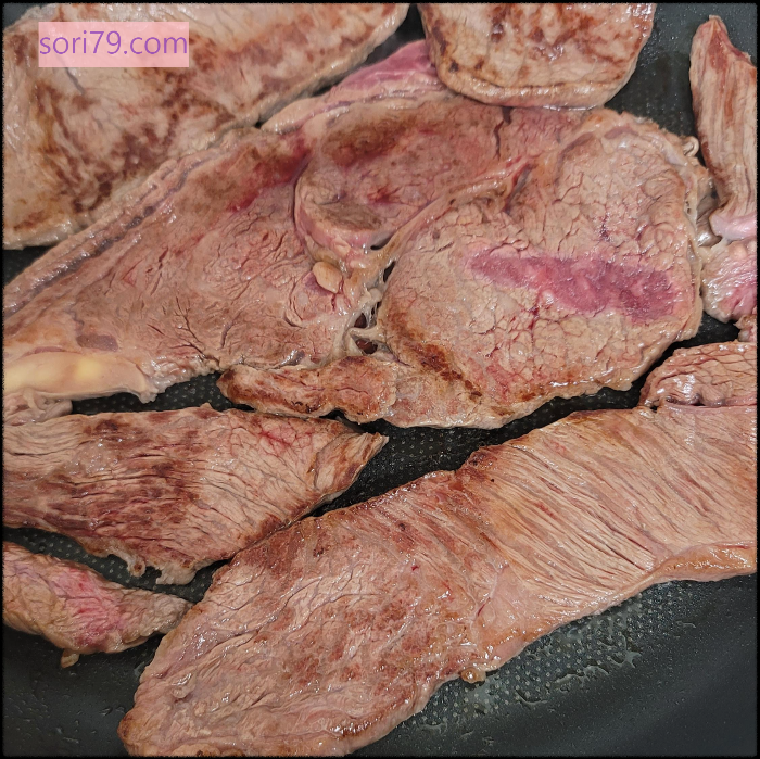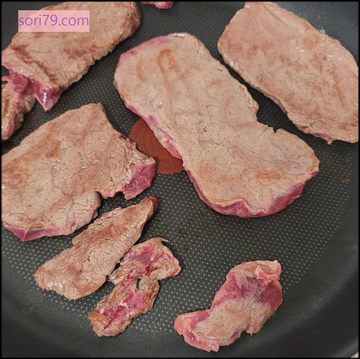 프라이팬에 굽기 위해 고기를 꺼내보니